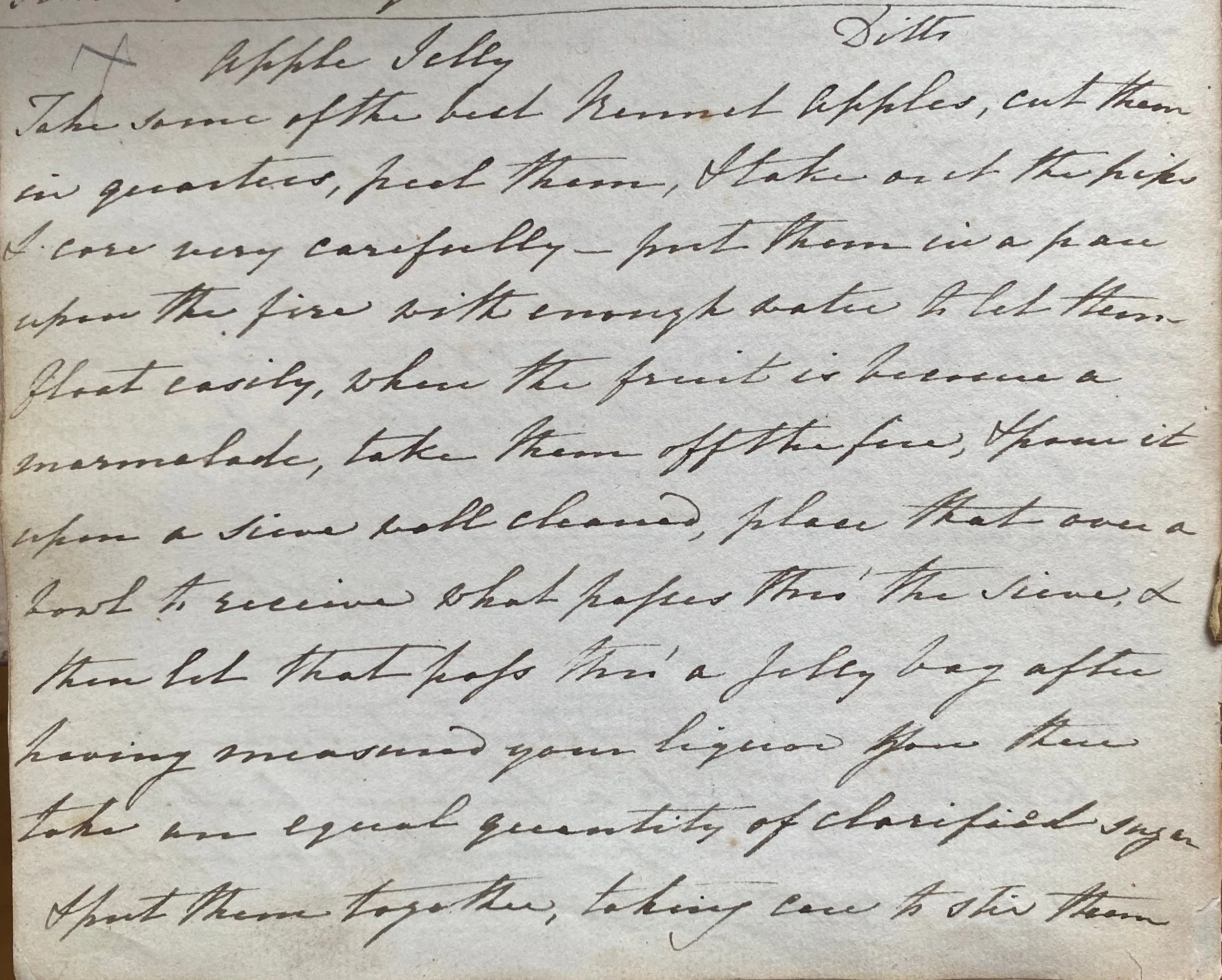 Take some of the best Russett apples, cut them in quarters, peel them, & take out the pips & core very carefully – put them in a pan upon the fire with enough water to let them float easily, when the fruit is become a marmalade, take them off the fire, & pour it upon a sieve well cleaned, place that over a bowl to receive what passes through the sieve, & then let that pass thru’ a jelly bag after having measured your liquor [?] then take an equal quantity of clarified sugar & put them together, taking care to stir them well while on the fire, to prevent rising over the pan which it is apt to do – When your liquor forms a sort of skin you take it off the fire & put it into your preserving pots, but not cover it up till the next day.