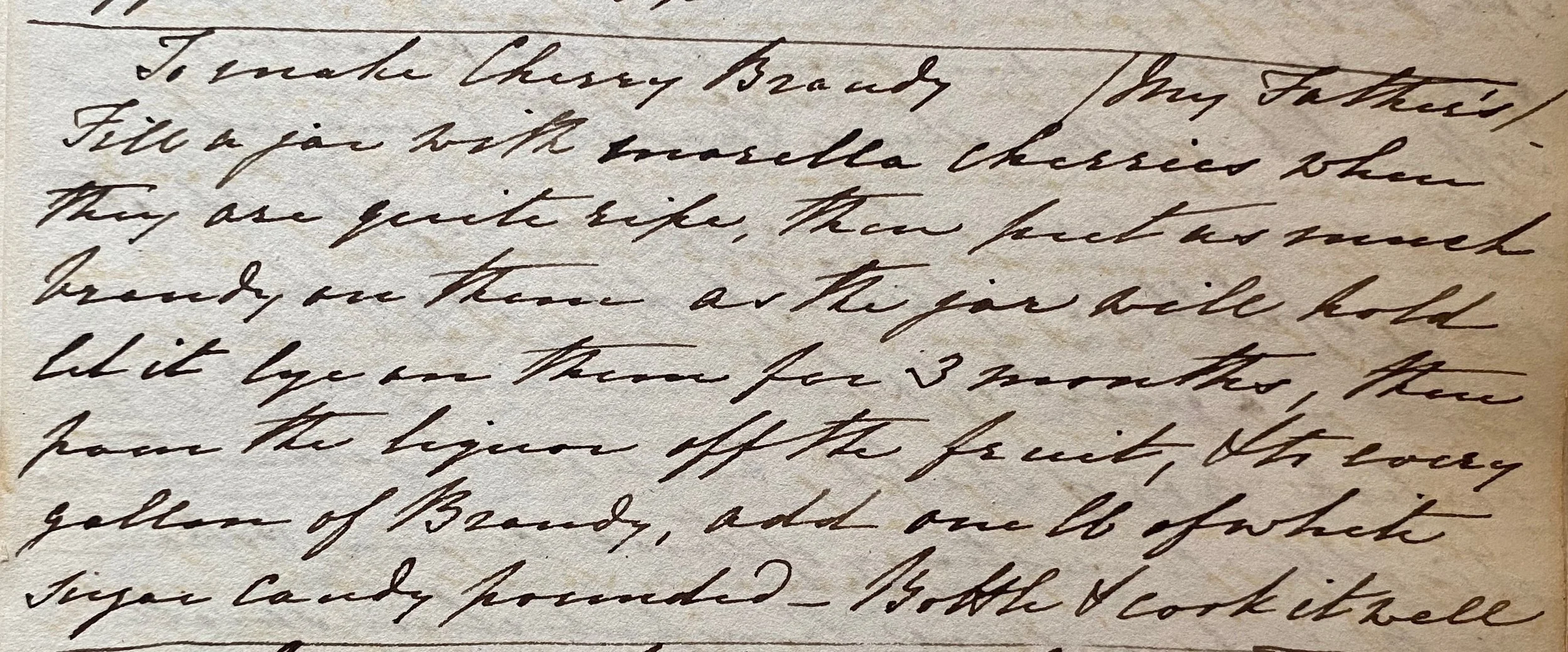 Fill a jar with morello cherries when they are quite ripe, then put as much brandy on there as the jar will hold. Let it lye on there for 3 months, then pour the liquor off the fruit, & to every gallon of Brandy add one lb of white sugar candy pounded [i.e. icing sugar] – Bottle & cork it well.