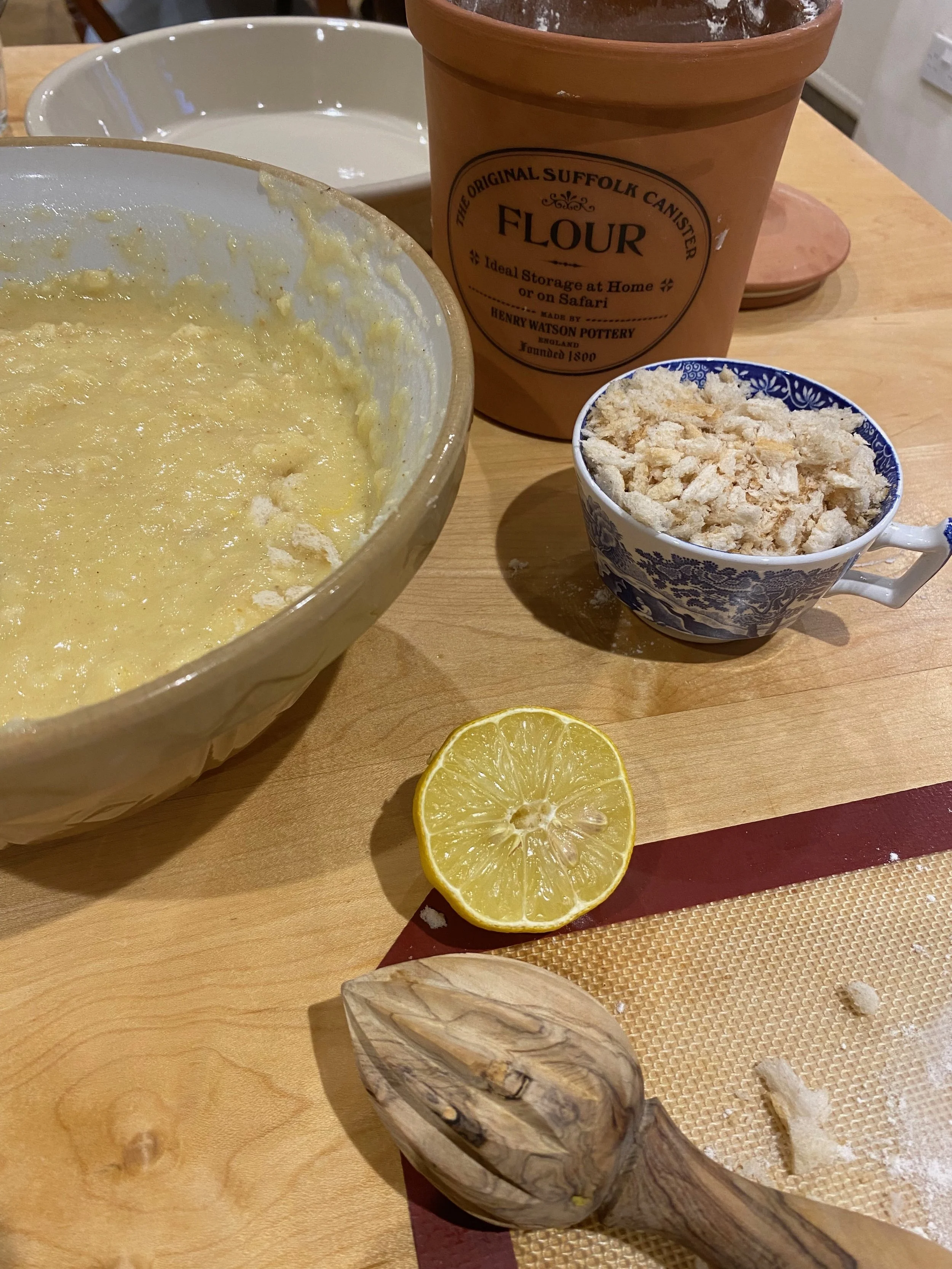 The eggy/apple mixture. To be authentic, I used an actual teacup for measuring the breadcrumbs!