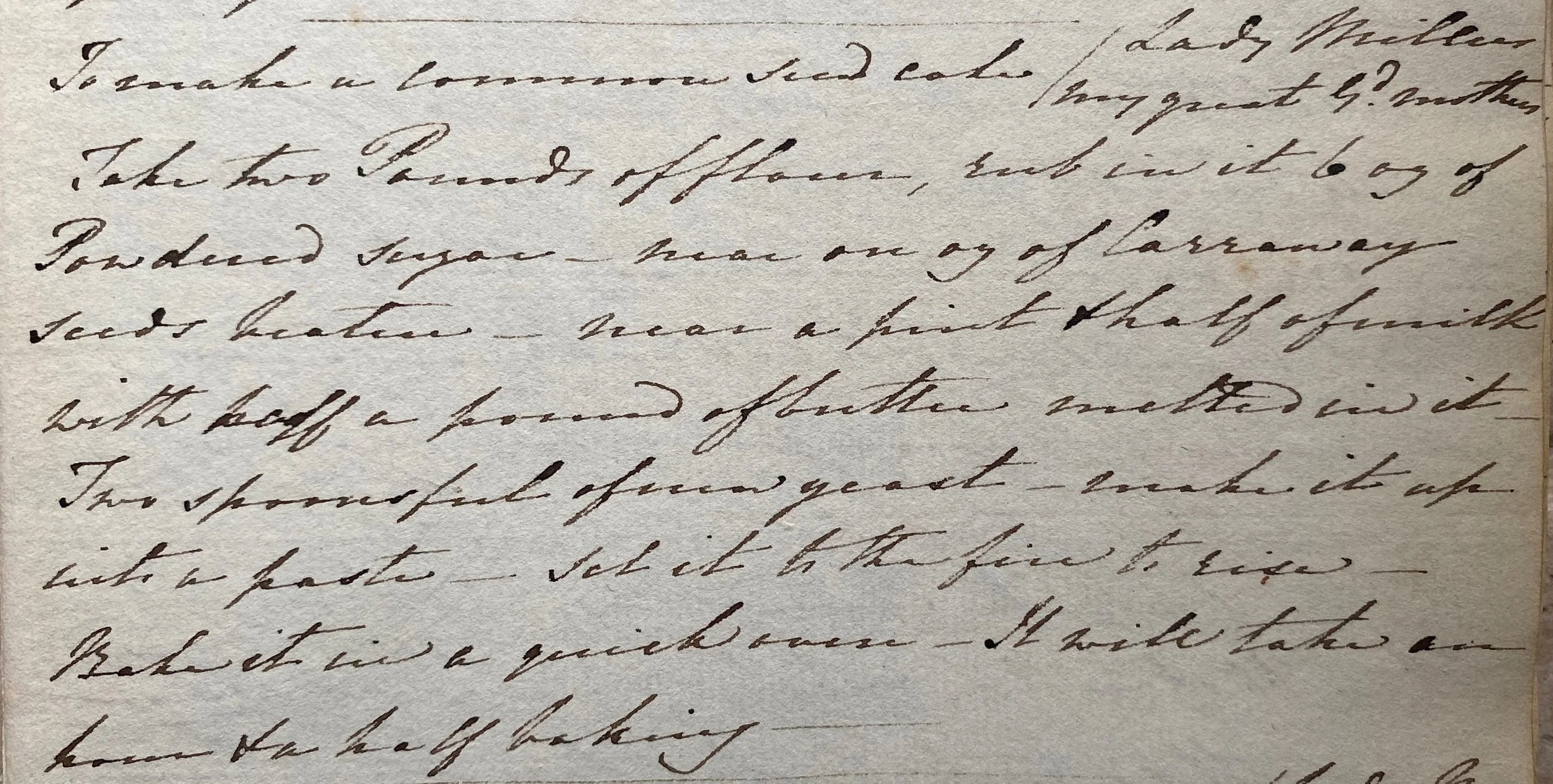 Take two Pounds of flour, rub in it 6 oz of Powdered sugar, mix an oz of Carraway seeds beaten – near a pint & half of milk with half a pound of butter melted in it – Two spoonsful of new yeast – make it up into a paste – set it to the fire to rise – Bake it in a quick oven – It will take an hour & a half baking –
