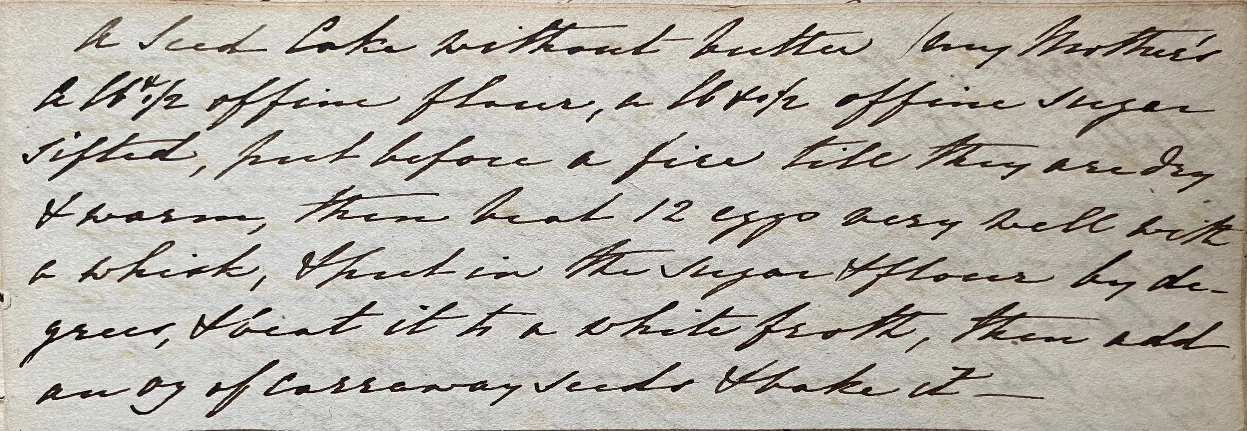 A lb & 1/2 of fine flour, a lb & 1/2 of fine sugar sifted, put before a fire till they are dry & warm, then beat 12 eggs very well with a whisk, & put in the sugar & flour by degrees, & beat it to a white froth, then add an oz of carraway seeds & bake it –